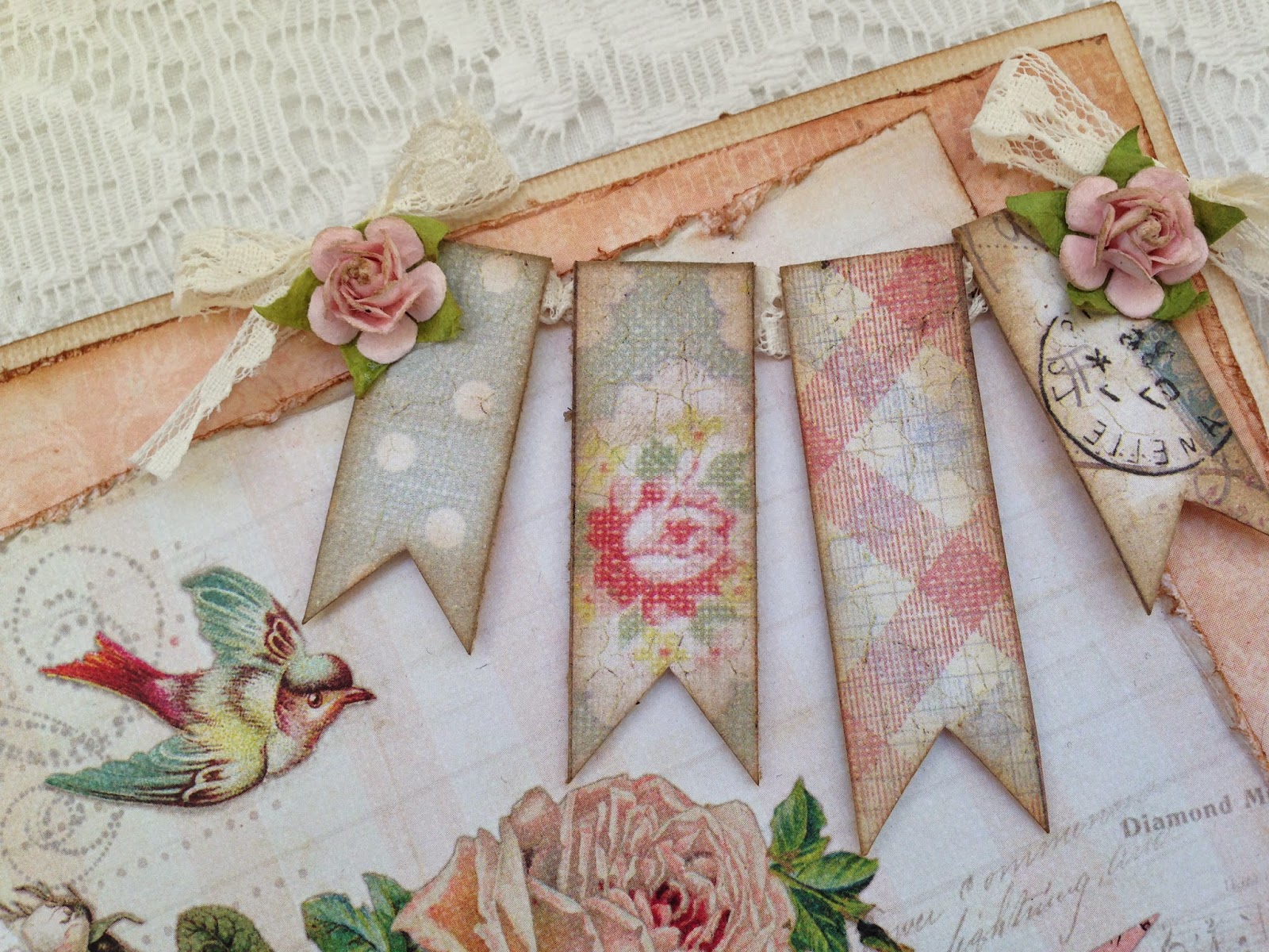 og laget ei vimpelrekke av smal blonde med rosepynt.