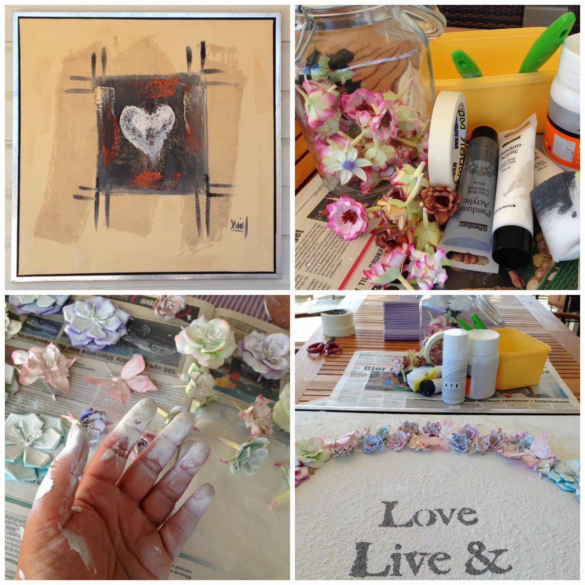 et par spraybokser hvitmaling, en tekstsjablon, en hekleduk,